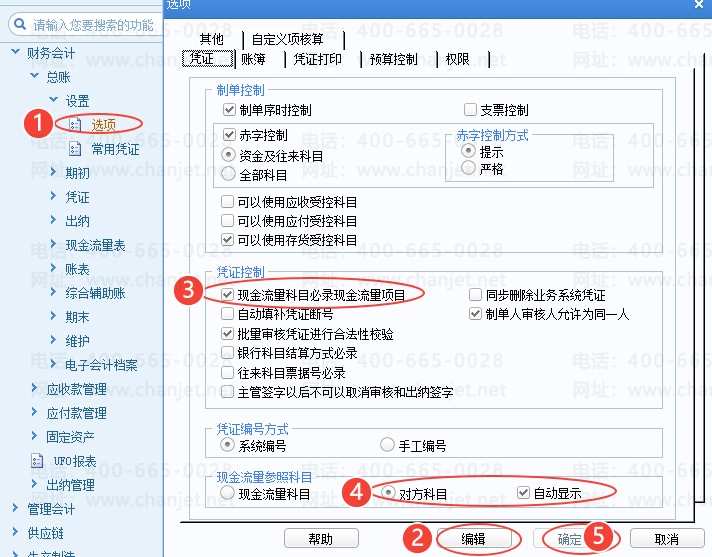步骤2:总账选项设置:勾选现金流量科目必录现金流量、现金流量参照科目选择对方科目