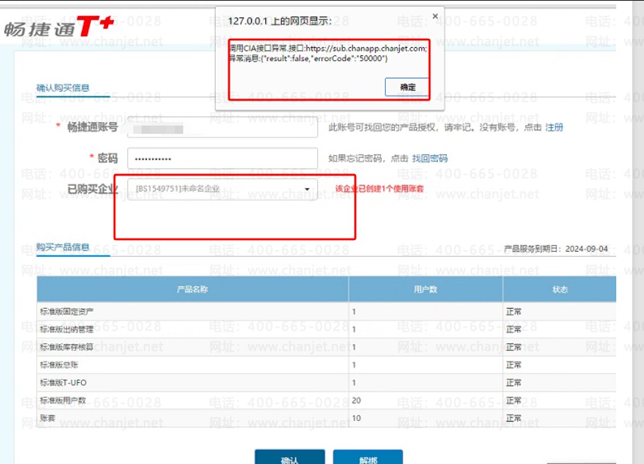 激活提示调用CIA接口异常.接口:https://sub.chanapp.chanjet.com;异常消息:{“result”:false,”errorCode”:”50000*}。