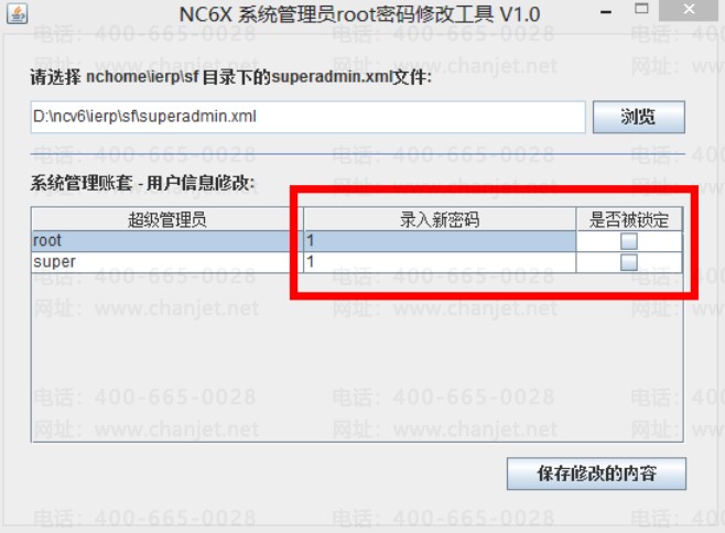 4.点击“保存修改内容”按钮,系统自动将新密码保存到nchome\ierp\sf\superadmin.xml文件中。