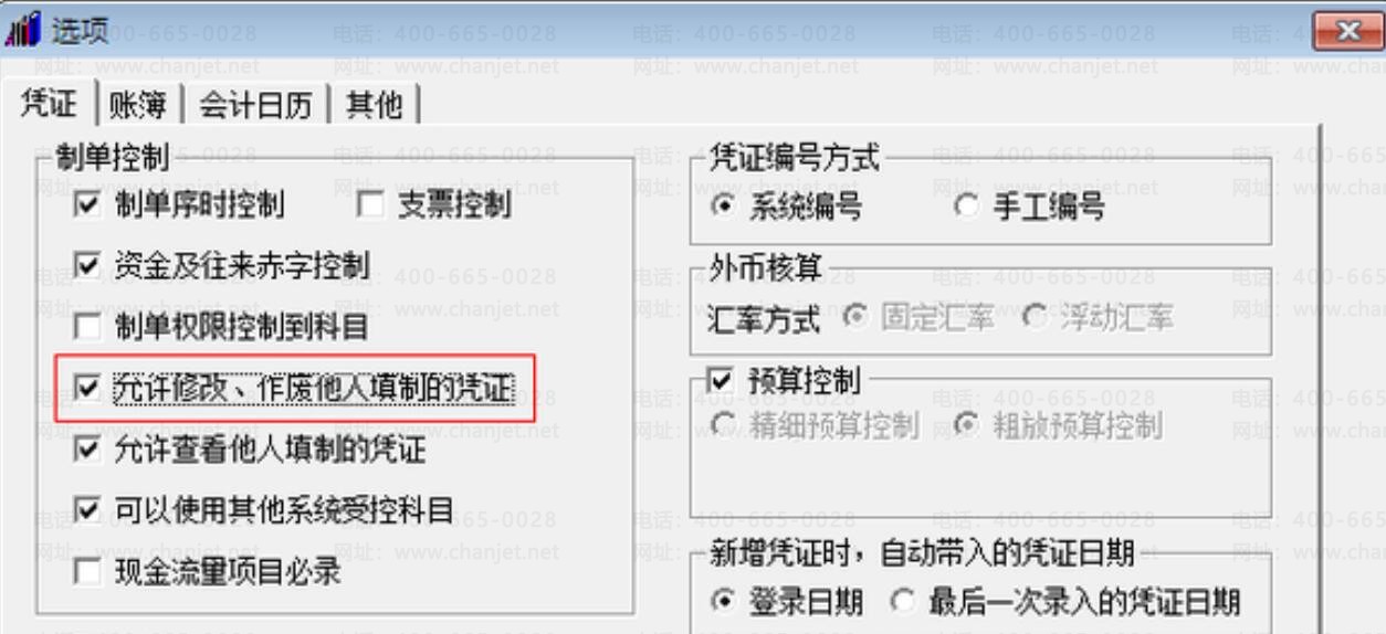 2、在选项中,查看凭证页签下“允许修改、作废他人填制的凭证”是否有勾选,如未勾选则将其勾选后点击确定。