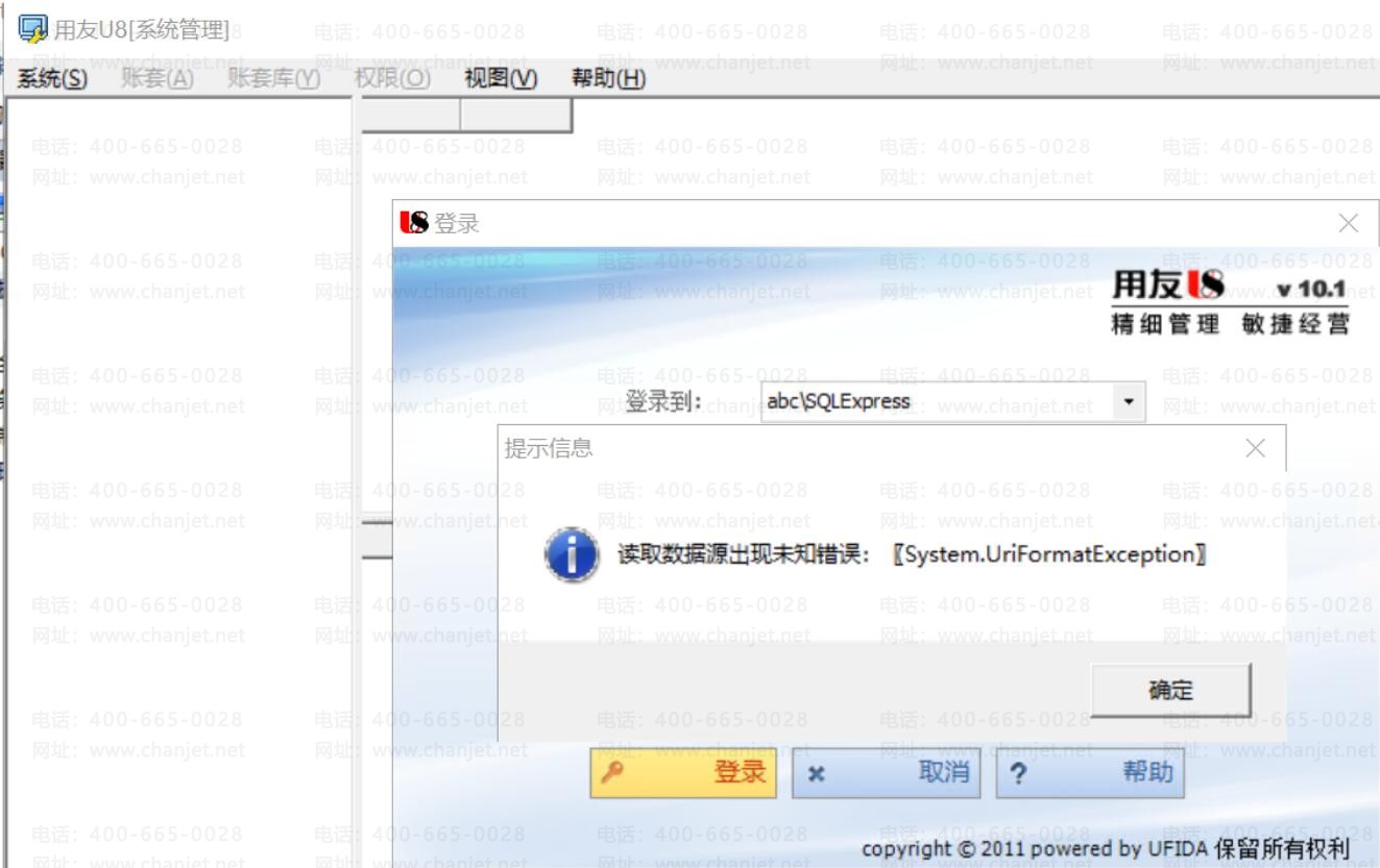 用友U8+10.1的东西,也不知道从哪里搞了一堆东西,咋玩耍都出现问题,然后就到了我这里问我咋处理,错误就是登录系统管理时提示“读取数据源出现未知错误 System.UriFormatException”,如下图所示