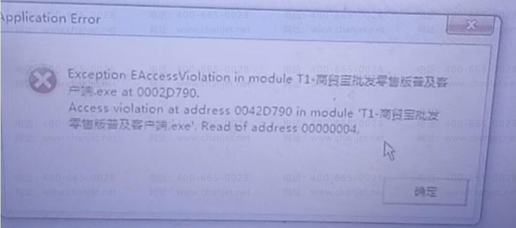 错误有如下两个,一个是“T1-商贸宝批发零售版普及客户端.exe 已停止工作”另外一个是“Excepton EAccessViolation in module T1-商贸宝批发零售版营及客户端.exe at 0002D790.Access violation at address 0042D790 in module 'T1-商贸宝批发零售版普及客户端.exe'Read of address 00000004.”如下面两张图所示