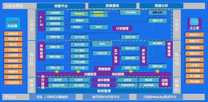 同时,项目实现了EBC五大链接:链接伙伴、链接客户、链接员工、链接设备和数据服务。信息化建设过程中链接100+家供应商到供应协同平台中;通过CRM集成覆盖并链接客户3300+家,通过云之家、掌上报销全员应用等,服务全公司90%以上员工;应用PLM实现研产供销一体化;搭建智能预测模型,为企业平衡备货和产能提供数字化支撑;应用轻分析平台使企业实现自主定制数据分析报表。与MES、APS系统对接,进一步精细化生产执行过程,满足企业智能制造车间快速运转的高效协同。