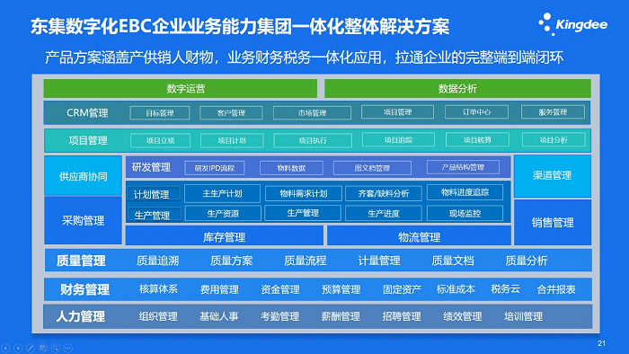 江苏东集有12家分子公司,经营业态各有不同,为了实现集团对所有分子公司的规范化管理,同时实现东集企业内部运营的数字化,全面打通“企业数据、技术、业务流程与组织架构”四个相互关联的要素,提高东集的整体管理水平,就成为东集需要解决的难题。