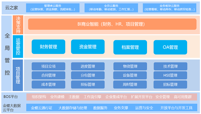 基于金蝶BOS开发平台,自主研发的工程项目管理系统,实现与财务系统的无缝衔接,将项目部的业务账梳理清楚,实现业务财务一体化,做到资金付款的双重控制;