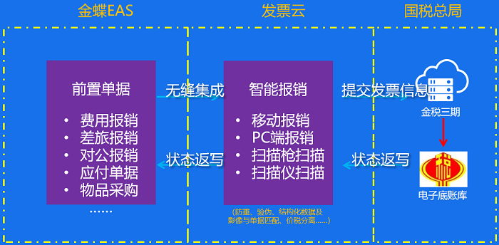 发票云+EAS,将发票的采集工作交由经办人完成,大大降低了财务人员扫描发票的工作量,系统自动识别鉴定发票真伪,减少人工核实出错的情况,拍照识别发票信息,尽量减少报销人填报的信息,通过手机即可完成报销业务。