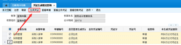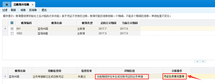 1. 出现上述情况,是因为当期确实有业务单据未生成总账凭证,此为正常检查,确保总账结账时所有业务单据均生成总账凭证。