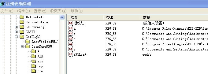 在OpenSaveMRU下,按最近Windows打开过的文件类型,建立了不同的分支。如金蝶账套文件AIS分支下,就是最近打开过的AIS的文件列表,在各分支下,把除MRUList键名以外的值删除