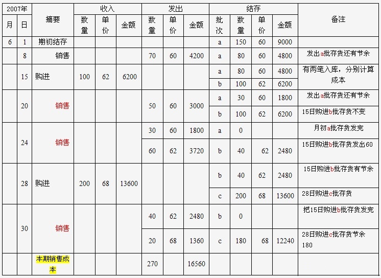 注:分批认定法的管理模式,先进先出法的核算过程类似,区别在于它不再按存货的收入顺序来计算成本,而按指定的批次来计算成本。