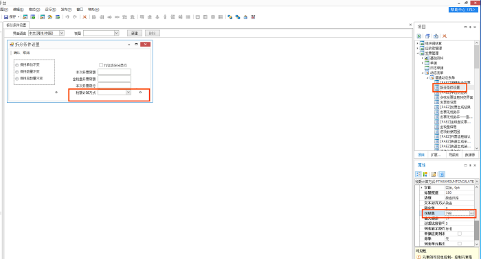 在拆分条件界面增的税额计算方式下拉选框,默认是不显示的,需要从BOSIDE开放可见性。从BOS IDE放开可见后,显示的界面中税额计算方式默认为“固定比例”,可以手工从下拉框中选择其他方式。