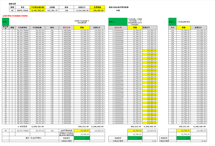 以不含税金额为4707398.23的发票为列,发票限额为100000,需要拆分成48张金税发票。注意观察三种方式拆分出的最后一张金税开票单的税额差异区别、每张金税开票单的价税合计区别。