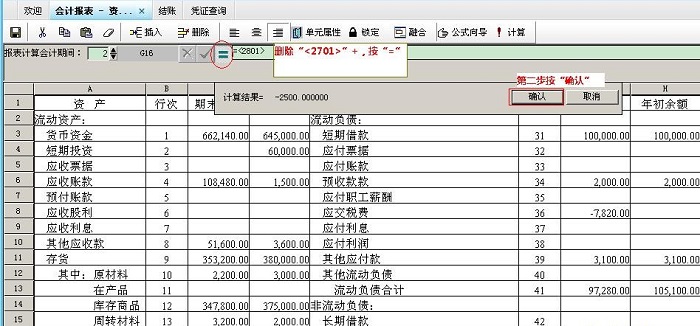 选择“长期应付款”期末余额单元格,删除公式栏“<2701>+”,按“=”键,再点击“确认”保存公式