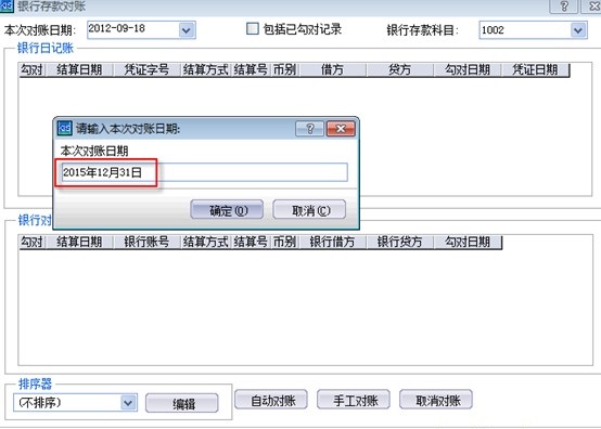 l 银行存款日记账与对账单的对账工作(建议按实际相符的账务时间进行勾对,比如实际账务已经是2015年12月31日,进行对账时的自然时间是2016年1月17,在对账时的对账日期建议设置为2015年12月31日,参考下图)