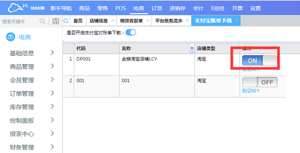 2、在电商模块--打开控制版面-下载管理-支付宝账单下载界面,