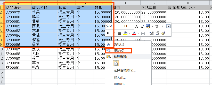 1确保表格列头的字段和支持的字段一致,选择后“复制”或Ctrl+C(系统支持可粘贴的字段有:条形码、SKU码、商品编码、客户商品编码、单位、数量、仓库、仓位)。