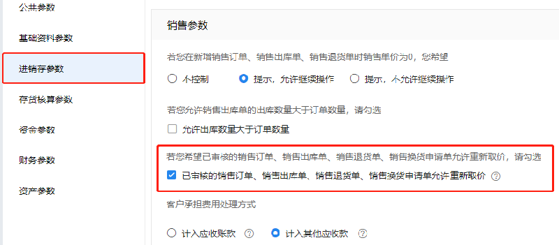 1、首先要在【系统设置】-【系统参数】-【进销存参数】-【销售参数】中开启允许重新取价的功能(如下图)