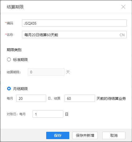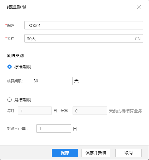 在【基础资料】-【结算期限列表】中,点击右上角的“新增“按钮,录入编码、名称,并设置好期限类别,单击“保存”即可新增,单击“保存并新增”则保存后继续下一个新增。