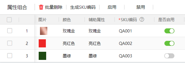注:如果商品资料中的SKU编码没有勾选“是否启用”,则在条码标签打印中会选不到商品,无法打印。打印效果如下(即墨绿色不允许打印):
