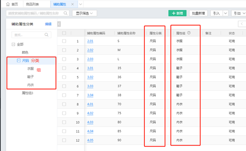 如图所示的第一级为辅助属性分类,分类下的第二级则为属性的分组,即属性组。