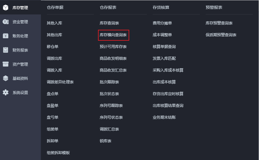 2)功能入口:库存管理-仓存报表-库存横向查询表