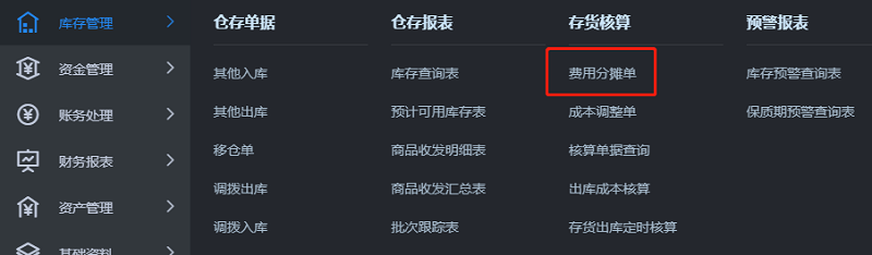 1)费用分摊单的打开路径:【库存管理】-【存货核算】-【费用分摊单】