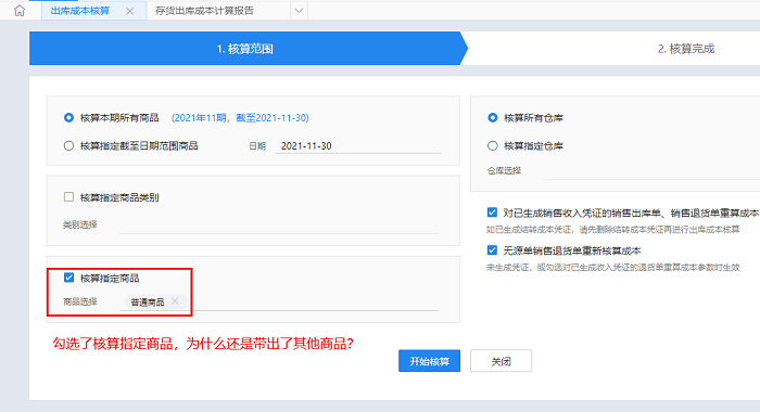 出库成本核算勾选了【核算指定商品】,为什么成本计算报告中还是核算出了其他商品?