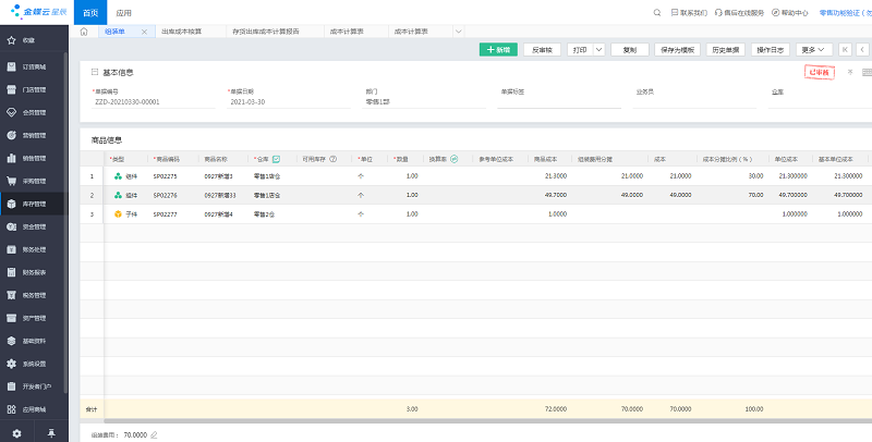 2、通过【存货出库核算】,系统会自动将分摊的组装费用,加上子件的成本,计入组装件入库成本,成本计算表如下图所示: