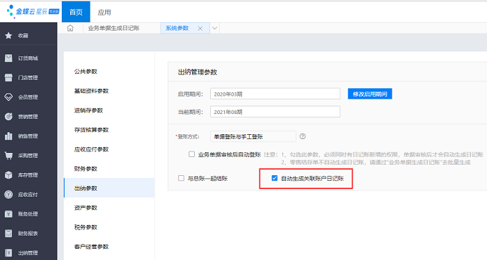 系统参数-出纳参数下勾选【自动生成关联账户日记账】