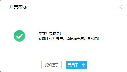 弹窗提示“提交开票成功”后系统将自动完成开票,点击【开具下一个】按钮可以继续开具下一张发票。