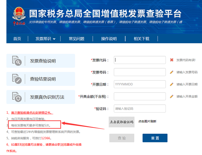 根据国家发票查验平台要求,单张发票每天只能查验5次,如超过就会出现上图提示,需等到第二天才可以重新获取