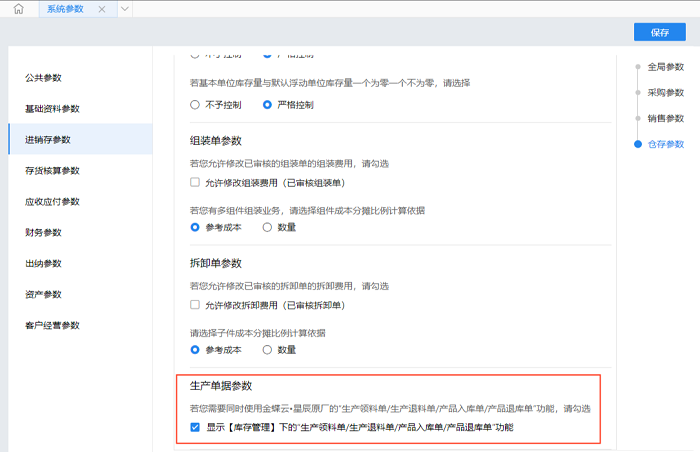 ③如使用了生态产品的生产管理,在库存单据里这4张单据未显示,则需在系统设置-系统参数-进销存参数-生产单据参数中,勾选“显示【库存管理】下的“生产领料单/生产退料单/产品入库单/产品退库单”功能”这个参数。
