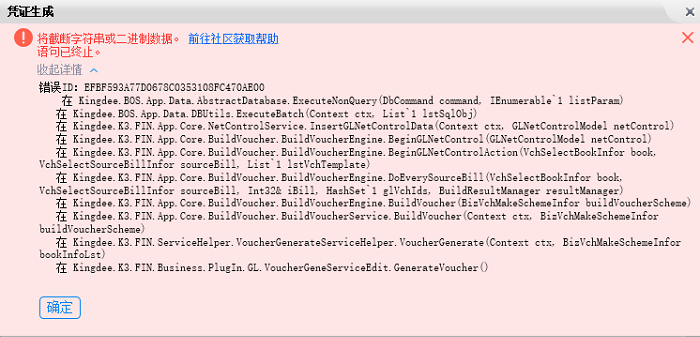 金蝶软件凭证生成报错提示:生成凭证截断字符串或二进制数据。语句已终止