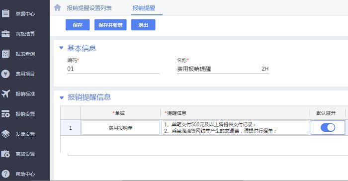 1、进入费用核算-报销设置-报销提醒设置,按报销单的单据类型设置报销制度提醒信息,如下图: