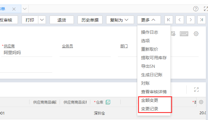金额变更,可处理在实际业务中,由于市场或者交易条件发生变化,而入库/出库单已经审核了,需要调整单据上的金额的场景,通过此功能,可以更真实反馈实际业务成本。