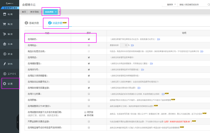1、【设置】-【系统参数】-【功能参数】,勾选是否启用审核功能;