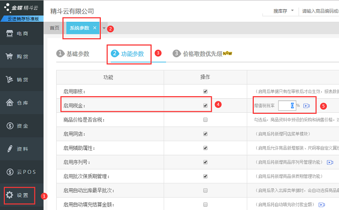1、【设置】-【系统参数】-【功能参数】-【启用税金】勾选后,设置税率,点保存,才可在单据录入/修改税率。