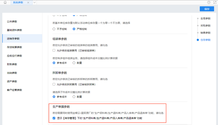 ③如使用了生态产品的生产管理,在库存单据里这4张单据未显示,则需在系统设置-系统参数-进销存参数-生产单据参数中,勾选“显示【库存管理】下的“生产领料单/生产退料单/产品入库单/产品退库单”功能”这个参数。