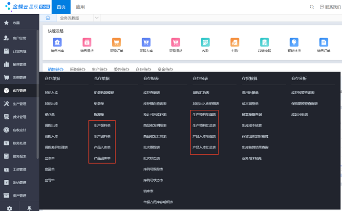 如客户未购买星辰生产管理,也是可以在库存管理-仓存单据里使用生产领料单、生产退料单、产品入库单、产品退库单这4张单据的。
