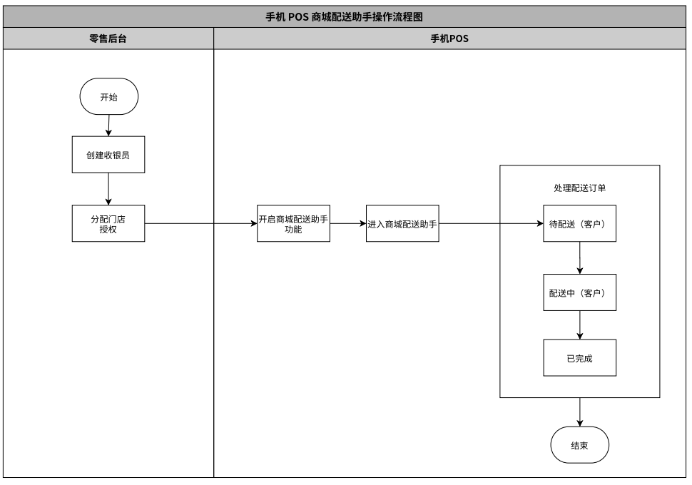 商家自有配送人员可通过手机 POS 商城配送助手实现商城配送订单的接单、查询和状态标记。适用于 拥有配送团队具备 自配送能力 的商家。