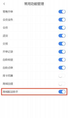 使用上⼀步创建的收银员账号, 登录手机POS, 前往《设置 - 常用功能管理》, 找到 打开开关启用该功能, 返回首页即可看到商城配送助手功能菜单。