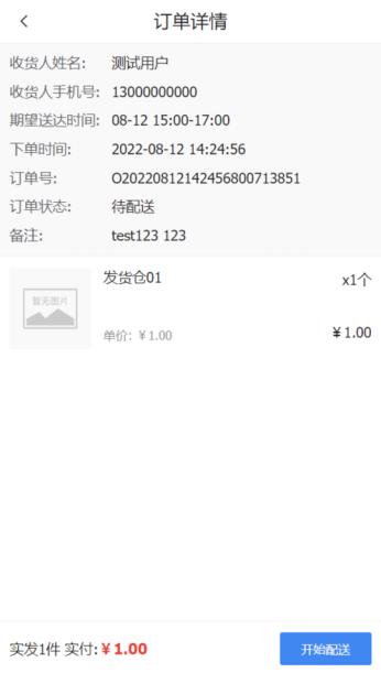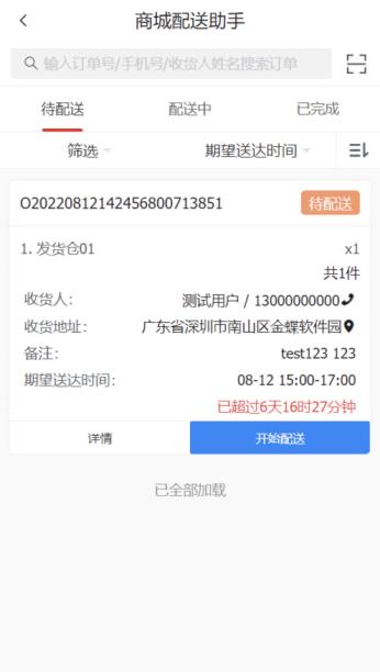 点击 【商城配送助手】 进入查看配送订单, 订单状态包括待配送、配送中和已完成, 可分别对不同状 态的配送订单进行处理。
