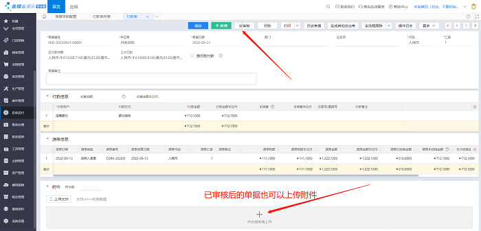 付款单做好后审核,后期又收到银行回单,希望把银行回单上传到付款单的附件中去