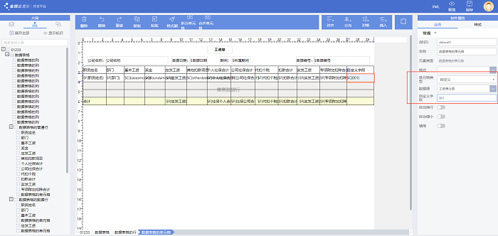 3)鼠标定位到需要打印自定义字段的单元格,右边的“单元格类型”,选择“自定义”;“数据源”选择“工资单分录”,“自定义字段”录入自定义工资项目的编码