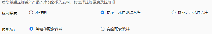 应用流程:与[系统参数-委外参数-入库前必须先发料]配合使用。在BOM子项中维护关键件或在委外加工单的材料信息中维护关键件,则可以根据参数中设置的控制强度对单据进行控制。如控制强度选择:提示,允许继续入库;控制项选择:关键件配套发料。则当关键件没有配套发料时,委外加工单入库保存时会进行提示:入库数量大于关键件发料套数,若点击继续,则可以保存。