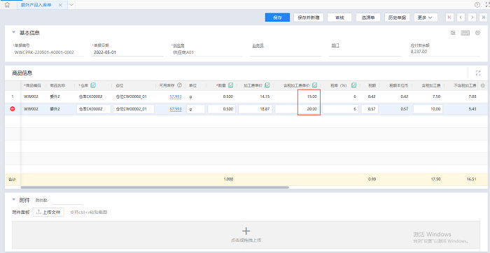 若同一批入库的相同商品委外的加工费单价不同,则需要将不同单价的商品拆分行进行入库,再生成委外加工费用单。如下图所示: