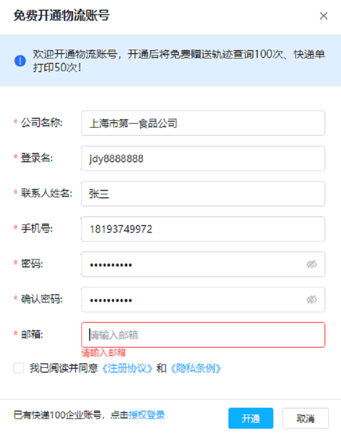 免费开通物流账号之后,会赠送100次物流轨迹查询、50次快递单打印的免费服务供您试用体验;