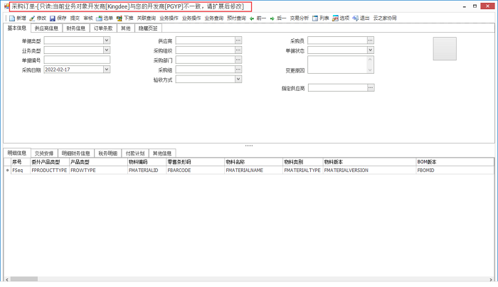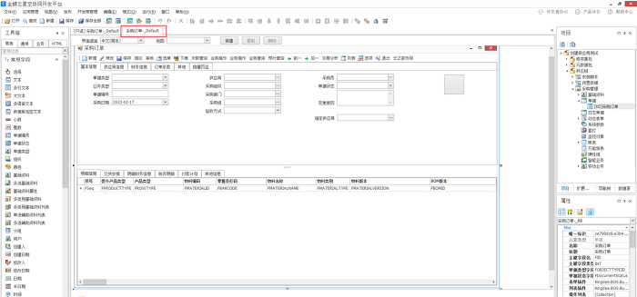 此时Tab页会增加一个“采购订单”,开发者可以开始在这个单据上根据项目需求进行定制,比如增加一个文本等。