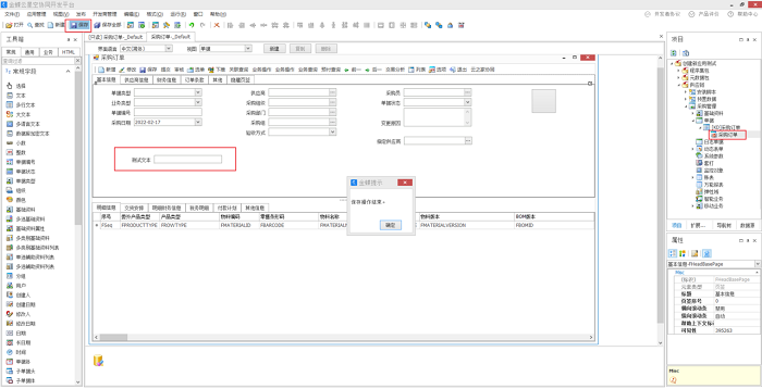 在示例中,增加了一个名为“测试文本”的输入框,接着需要点击左上角的“保存”按钮,保存成功后,右侧项目列表中就会增加一个“采购订单”节点。此节点当前的状态为“签出”,即当前用户可以编辑状态。