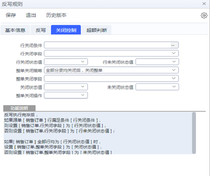 关闭控制仅是改变来源单据的状态字段的值,超额判断是强制控制什么情况下单据不允许保存或审核(视反写规则的操作决定)