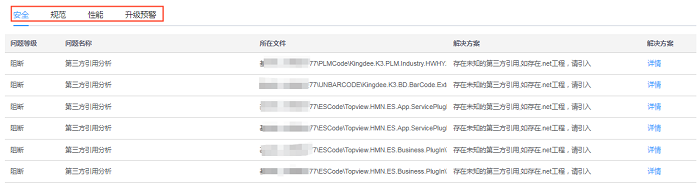质量监测平台把200+个检测项,分为四个维度:安全、性能、规范、升级预警;其中每个维度分为阻断、严重、主要、其他四个等级,其中阻断和严重等级是缺陷等级最高的,同时也是占比分数最高的,阻断和严重出现的越多,总报告得分就越低;在质量报告界面,在【缺陷列表】里面,提供四个维度所有的缺陷的检测项,如下图: